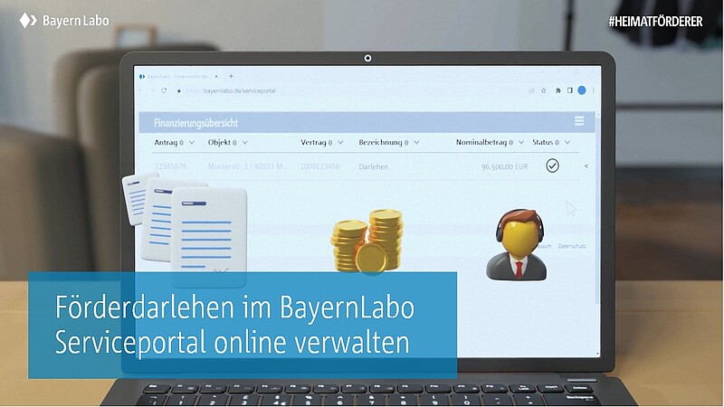 Als Kunde der BayernLabo können Sie Ihre Förderungen, Daten, Tilgungspläne, Darlehensverträge und alle wichtigen Dokumente sowie Informationen zentral online im BayernLabo Serviceportal ort- und zeitunabhängig verwalten. In diesem Video zeigen wir Ihnen: